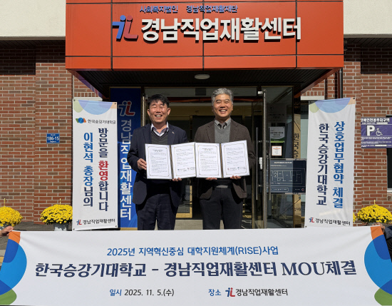 장애인 일자리 창출을 위해 한국승강기대학과 진주의 장애인 직업재활센터가 손을 잡았다. 경남직업재활센터는 거창에 있는 한국승강기대학교와 지난 5일 장애인의 취업 연계 활성화를 위한 상호 업무협약을 체결했다. 정희성기자 출처 : 경남일보(https://www.gnnews.co.kr) |